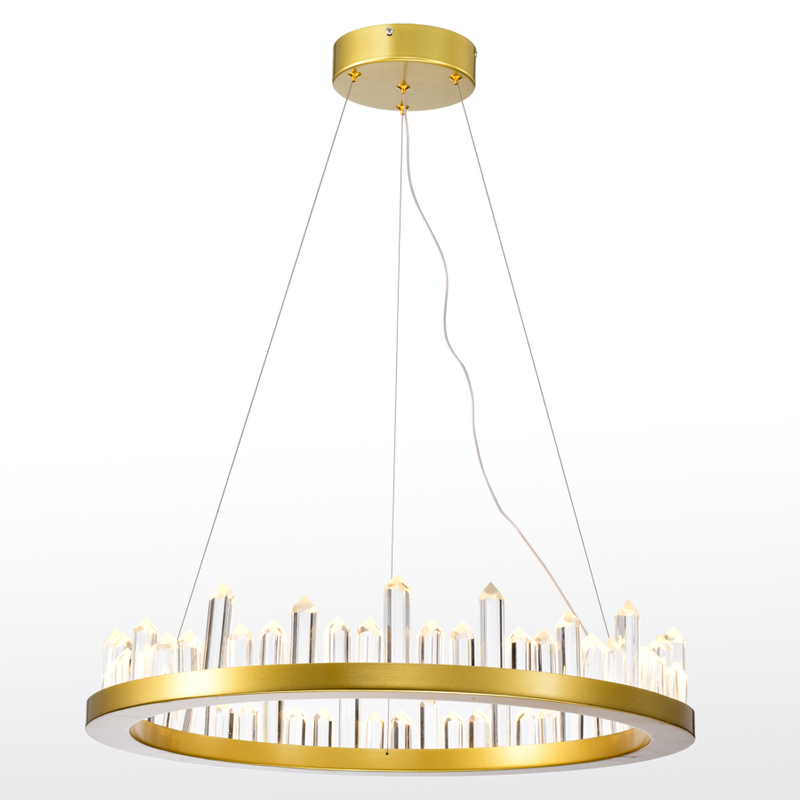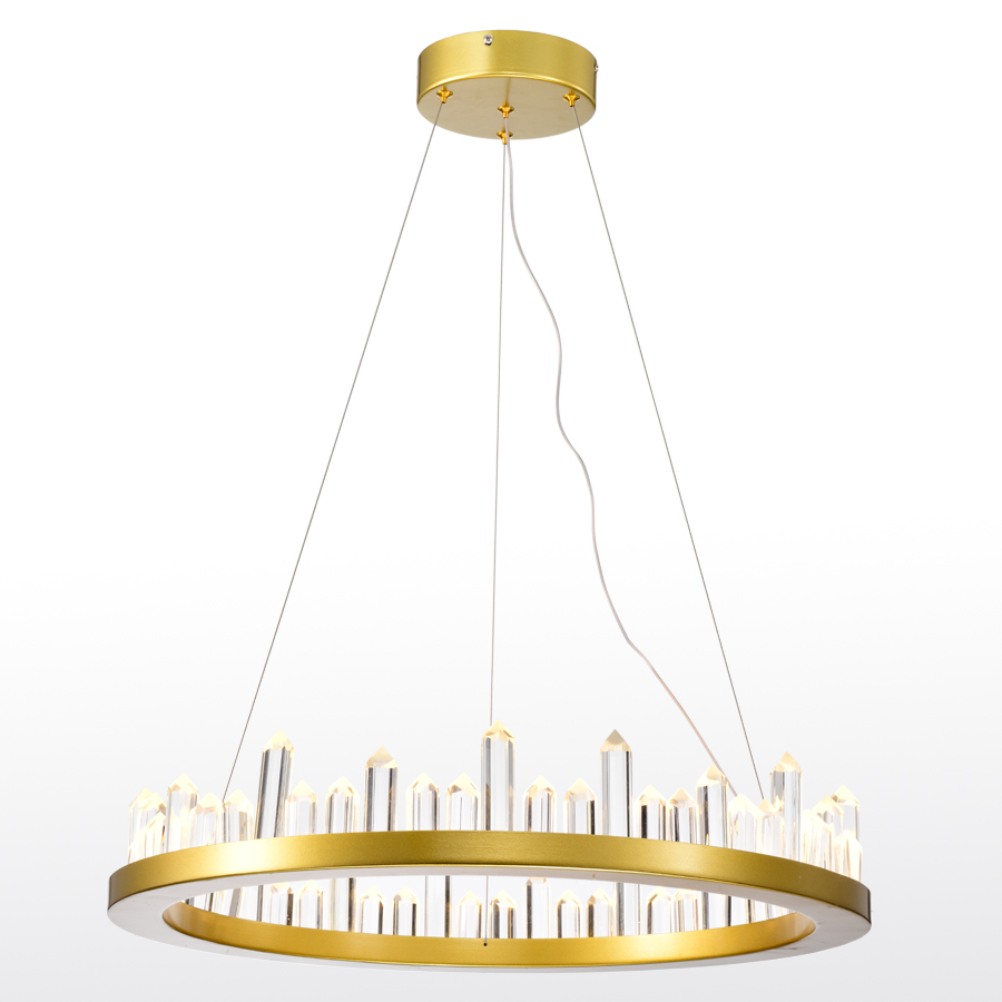 LED Pendant light, Round circle shape, it consist of crystal and iron .The crystal rods just like iceberg,and is magnetic,you can DIY arrange it.The light is 60 in diameter, has a power of 45W and a luminous flux of 2800 lumens. 3000K color temperatures provide comfortable lighting, ideal for creating a relaxing and inviting environment. Perfect for modern Spaces.