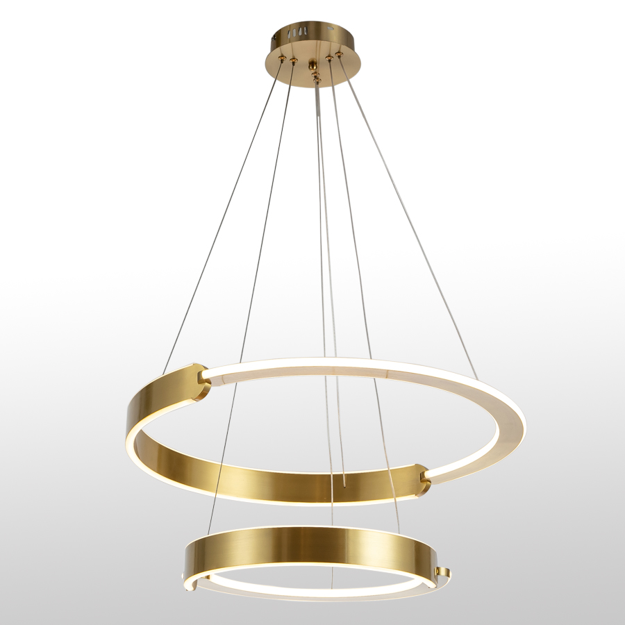Employs a multi-tiered concentric ring design, featuring gold-tone aluminum rings of varying sizes as frameworks paired with acrylic luminous rings. The composition includes: