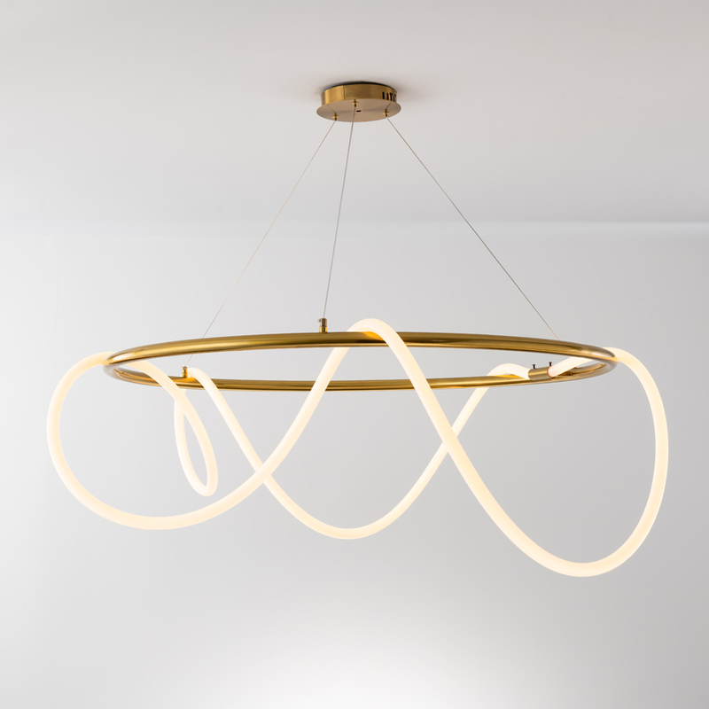 LED Pendant light, consist of a iron metal ring and a long flexible silicone tube.you can design how it look. .The light is 60cm in diameter, made of silicone, has a power of 60W and a luminous flux of 4000 lumens. 3000K color temperatures provide comfortable lighting, ideal for creating a relaxing and inviting environment. Perfect for modern Spaces.